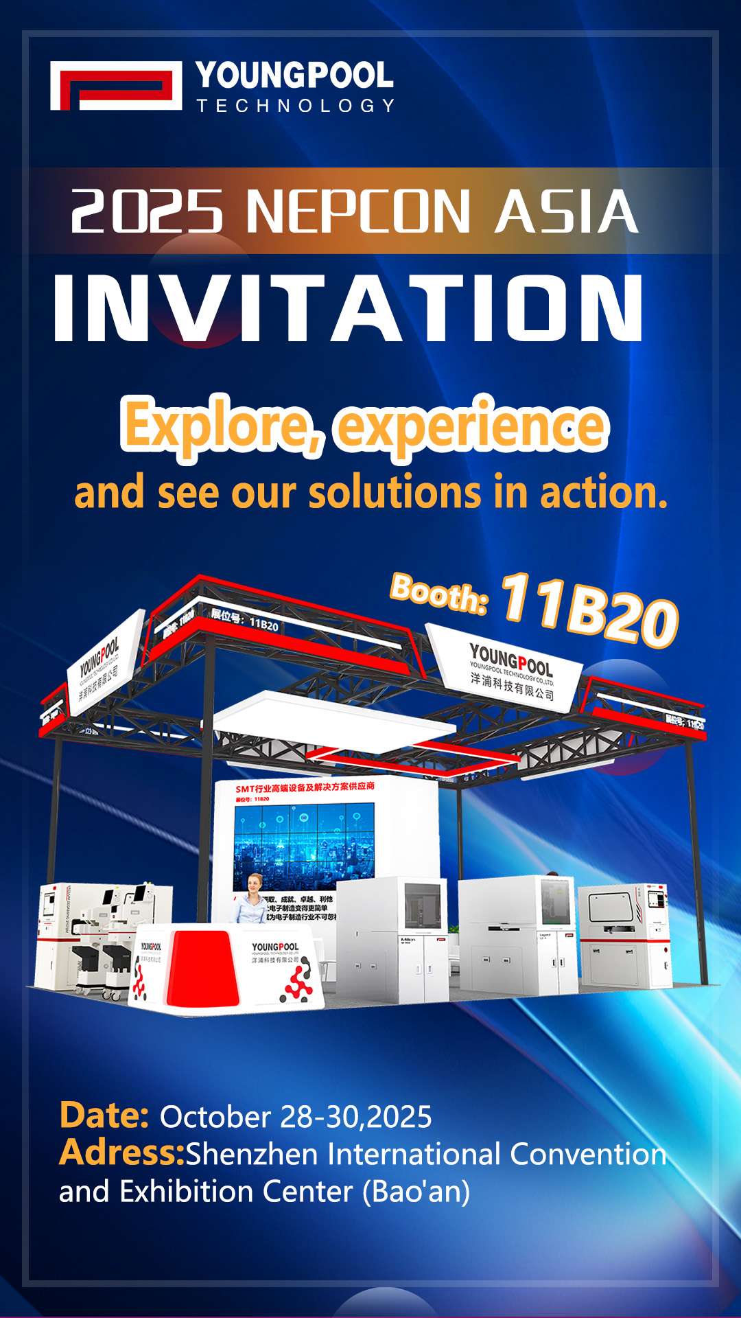 As the electronics manufacturing industry continues to advance toward greater intelligence and precision, NEPCON ASIA, one of the most influential professional exhibitions in Asia, remains a vital platform for industry professionals to gain insights, exchange ideas, and foster collaboration.From October 28–30, 2025, NEPCON ASIA will be grandly held at the Shenzhen World Exhibition & Convention Center (Bao’an). As a trusted equipment and solutions provider with 20 years of deep expertise in the SMT industry, Youngpool Technology will showcase a wide range of innovative, self-developed equipment, joining hands with industry peers to explore the future of electronic manufacturing.